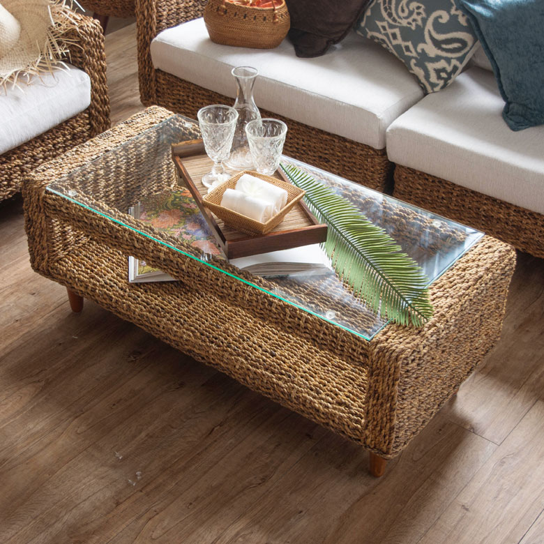 ■センターテーブル アバカ素材 強化ガラス天板 幅100cm 収納棚付き [96015] アジアンテイスト リビングテーブル ローテーブル ディスプレ
