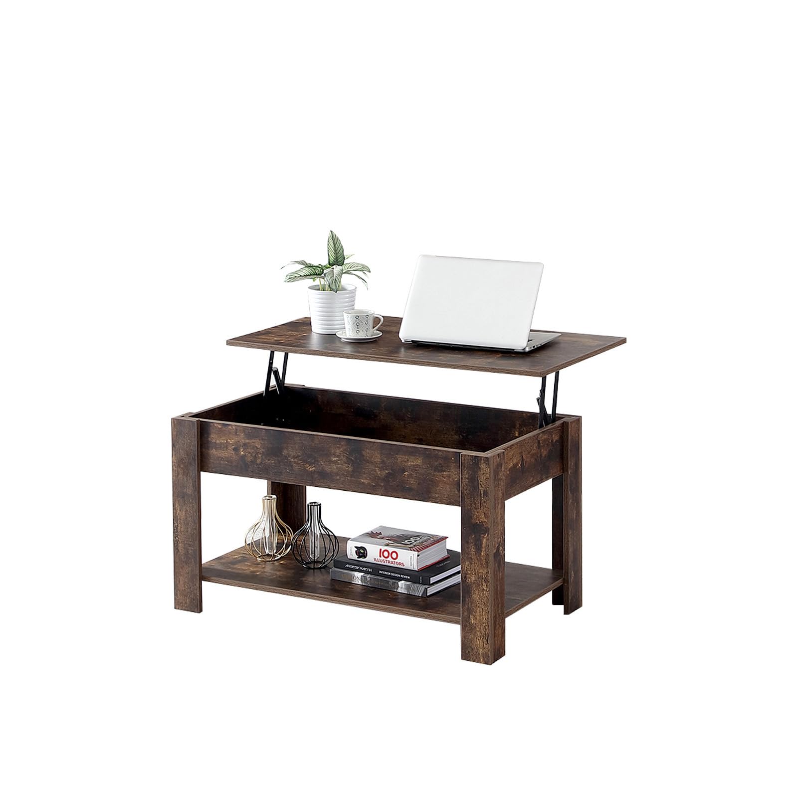 ■FUNROLUX ローテーブル 昇降式 コーヒーテーブル センターテーブル 収納棚付き 隠す収納 幅90×奥行50×高さ50-62.5cm 大容量収納空間 組