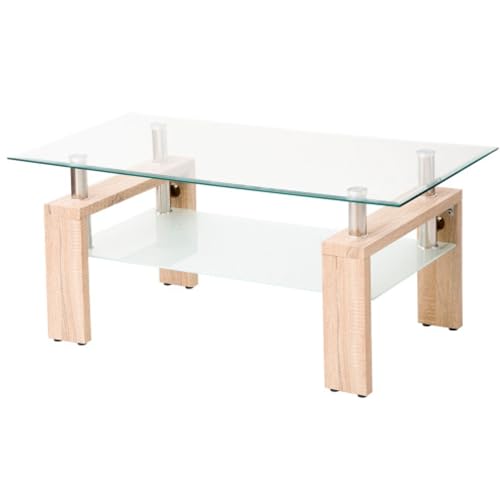 ■OSJ ガラステーブル コーヒーテーブル 強化ガラス天板 幅88cm クリア天板+木目PVC脚 木製脚