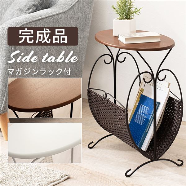 ■サイドテーブル エンドテーブル コーナーテーブル 小型 脇台 机 ミニテーブル 約幅46.5cm ダークブラウン マガジンラック付 金属 スチー