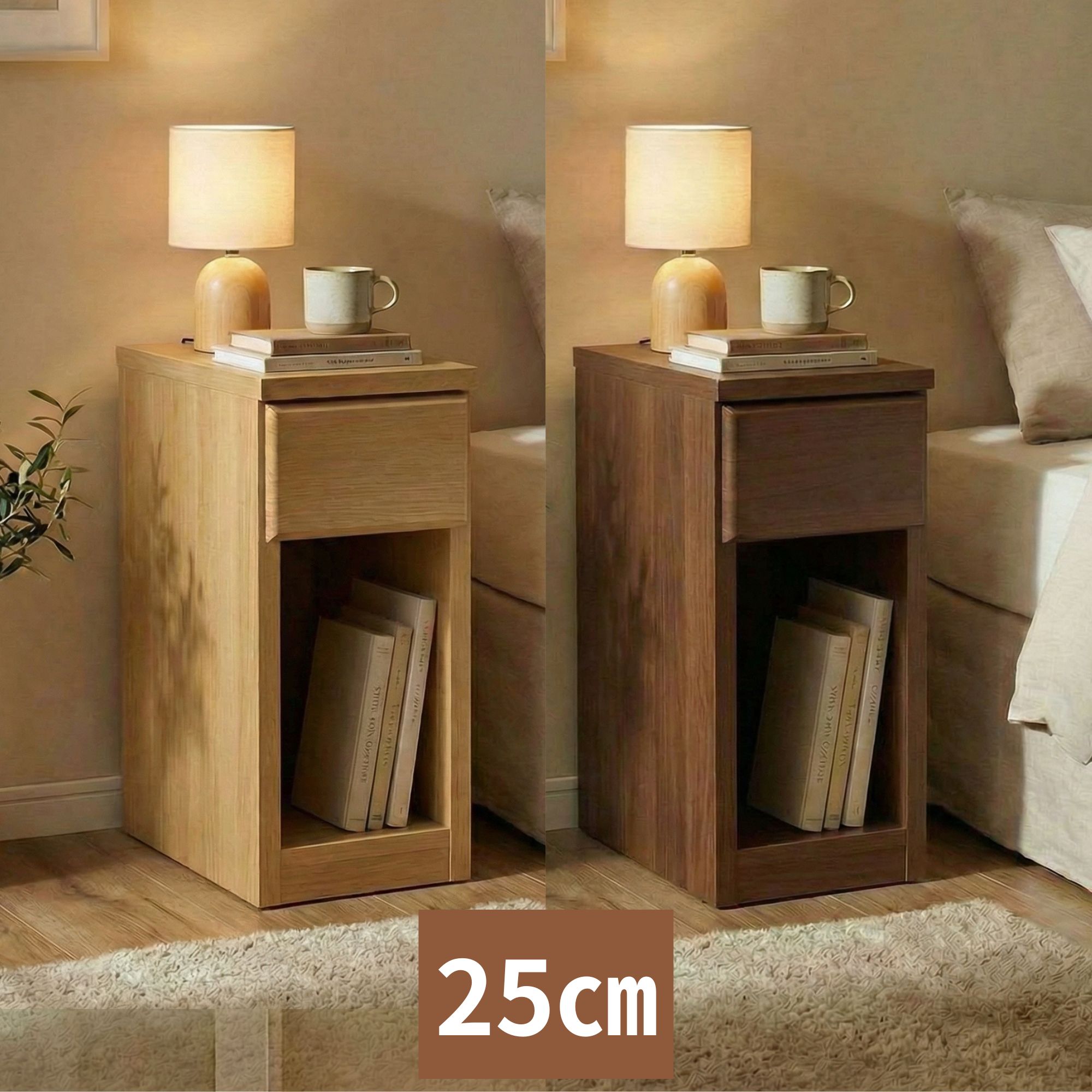 25cm幅のナイトテーブルです。 天板にはコンセントが2口ついているので、携帯の充電や照明などの使用にも便利です。 引き出しと扉無し収納が付いています。 木目が美しいアルダー材を使用しております。 商品サイズ:W25×D35×H44cm 材質:アルダー材 ※基本送料無料(沖縄県・北海道等の一部地域・離島等の条件によりましては別途送料が必要となります。)
