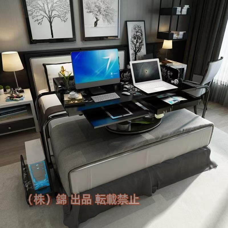 ■テーブル 特大 ベッドテーブル サイドテーブル 140cm×45cm ブラック 株式会社錦 昇降式 角度調節可能 テレワーク キャスター付き 木製