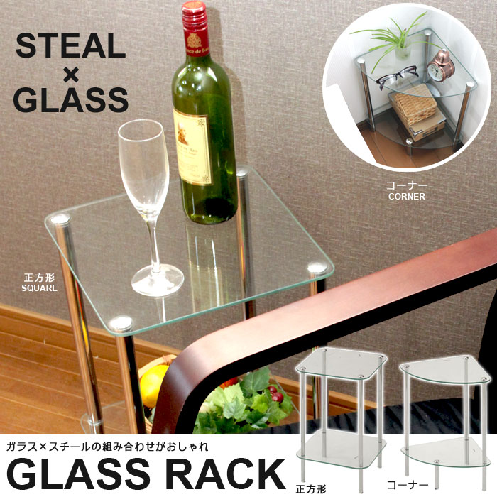 スチール×ガラスの組合せがスタイリッシュなガラスラック。ベッドやソファサイドに置いてサイドテーブルとして使ったり、お気に入りの小物をディスプレイしたり、電話台として使ったりと用途いろいろ。ガラスなので圧迫感がなく、置いてあるだけでおしゃれな空間に。ガラスは5mm厚強化ガラスを採用。しっかりとした厚みがあり、約2kgの重さにも耐えることができます。長方形(レクタング)タイプ、正方形(スクエア)タイプ、コーナータイプと3タイプよりお選びいただけます。【仕様】■サイズ:[長方形]約幅45×奥行30×高さ46.5cm(約3.5kg) [正方形]約幅30×奥行30×高さ46.5cm(約2.5kg) [コーナー]約幅30×奥行30×高さ46.5cm(約2kg)■カラー:シルバー■材質:[本体]5mm厚強化ガラス、スチールパイプ [塗装]クロムメッキ■耐荷重:[ガラス1枚当たり]約2kg■生産国:台湾■組立区分:お客様組立品(組立時間:約15分)■サイズ:[長方形]約幅45×奥行30×高さ46.5cm(約3.5kg) [正方形]約幅30×奥行30×高さ46.5cm(約2.5kg) [コーナー]約幅3
