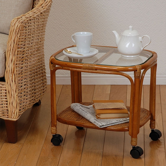 ■サイドテーブル おしゃれ 通販 RT-758 ナイトテーブル ガラステーブル サイドラック 籐 ラタン キャスター付き ガラス 天板 ローテーブル
