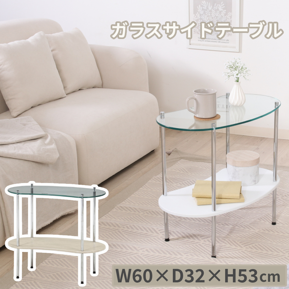ガラスサイドテーブル ホワイト/木目 【 商品詳細 】 ■サイズ:(約)幅60×奥行32×高さ53cm ■重量:5.5kg ■素材・材質 ・構造部材(天板):強化ガラス ・構造部材(棚板):合成樹脂化粧繊維板(PVC) ・構造部材(脚部):金属(鋼) ・表面加工(脚部):めっき(クロム) ■カラー:ホワイト・木目 ■JANコード ホワイト/ 4953980413154 木目/ 4953980413161