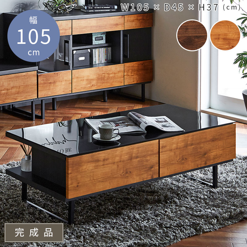 ヴォルト 105cm幅 センターテーブル■本体サイズ:幅105cm×奥行45cm×高さ37cm■梱包サイズ:幅107cm×奥行47cm×高さ24cm■素材 前板:強化紙 天板:強化ガラス4mm 引出し:スライドレール 脚:ブラックアイアン■収納スペース 引出し:幅36.5cm×奥行27.5cm×高さ14.5cm(内寸)×2杯 オープン:引出し以外のコの字型部分 高さ17cm(天板〜底板間)■脚高:15cm(お掃除ロボット対応)【備考】こちらの商品は、ご注文を頂くごとにメーカーから当店へ入荷し、お客様宅へ発送する「メーカー発注品」です。メーカーの在庫状況などによりお届け日数が前後する場合がございますので、ご注文後に当店よりお送りする「入荷予定について」のメールをご確認の上、商品の入荷・発送をお待ちくださいませ。