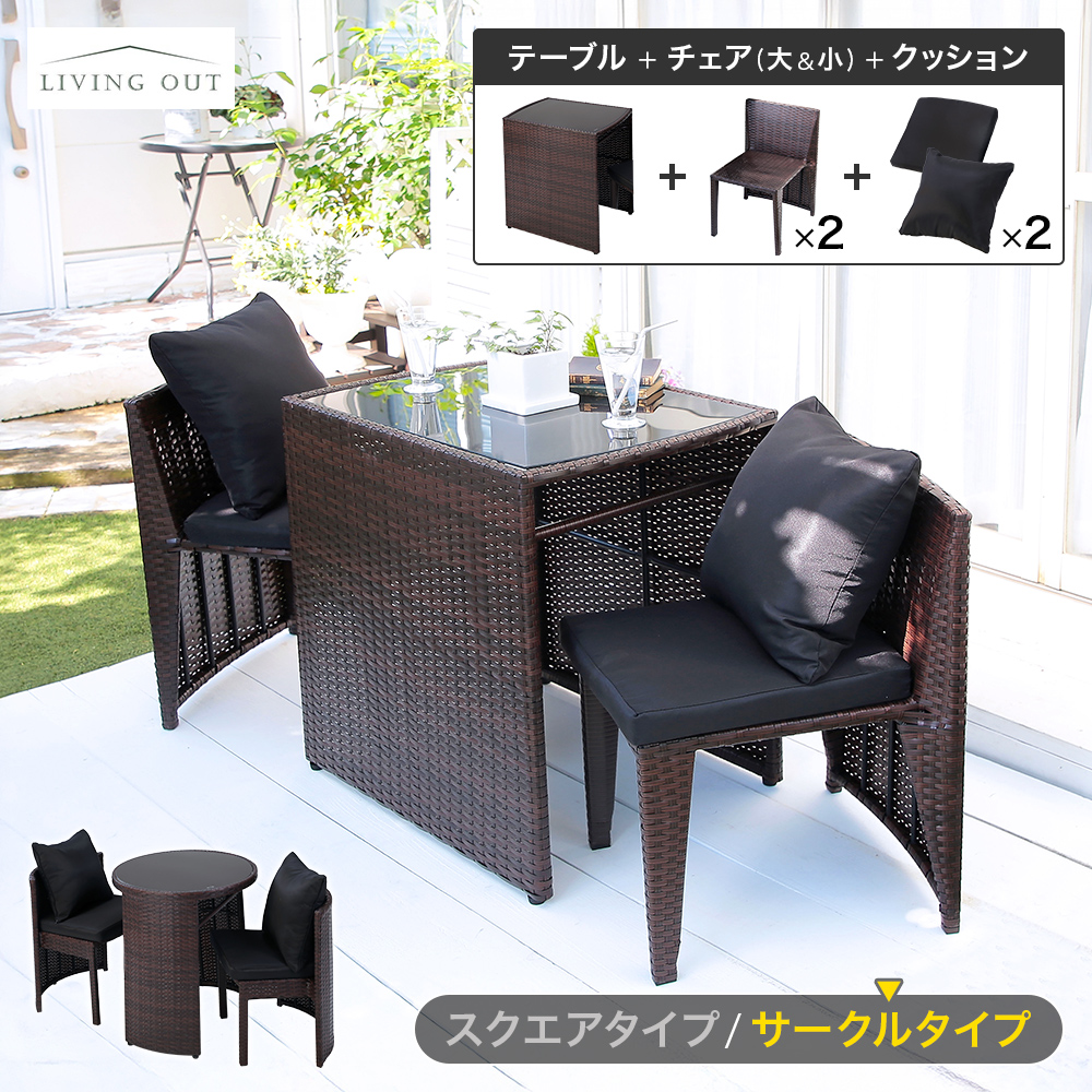 ■ラタン調コンパクトダイニングテーブルセット サークル クッション付き 座面クッション 背中クッション ガラステーブル チェア 一人掛け