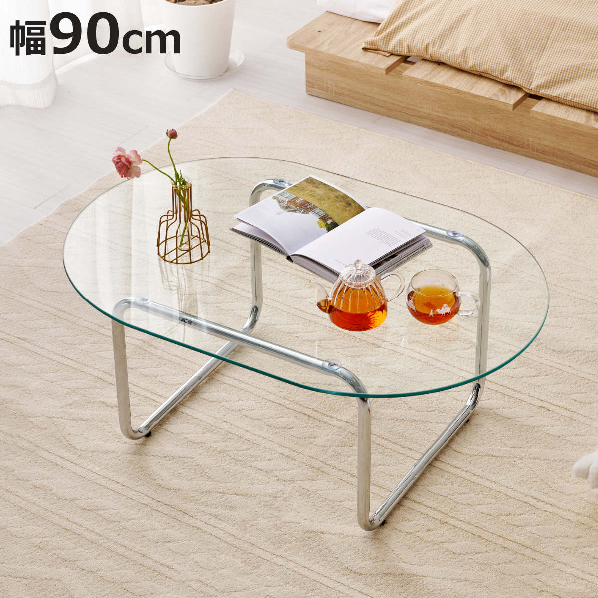 ■リビングテーブル 楕円 ガラス 幅90cm センターテーブル ( ローテーブル 丸 オーバル ガラステーブル 収納付き 丸テーブル リビング 座