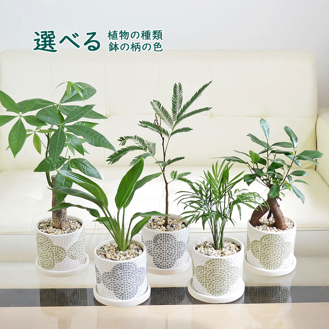 【ご確認ください】 北海道・沖縄・離島へはお届けできません。 【商品サイズ】 商品全体の高さ(鉢含む) エバーフレッシュ: 約25cm - 45cm 前後 ガジュマル: 約20cm - 40cm 前後 テーブルヤシ: 約20cm - 40cm 前後 パキラ: 約30cm - 50cm 前後 レギネ: 約20cm - 40cm 前後 鉢の高さ: 約9cm 幅: 約11cm ※植物につき、高さや形状には誤差がございます。 ※鉢は±数cmほどの誤差がある場合がございます。 【商品内容】 観葉植物 花柄テラコッタ鉢 x 1 受皿付き 管理方法のメモ付き ※葉や幹にはキズや一部変色した部分、カットした部分がある場合がございますが、生育に問題ないと判断したものを出荷しておりますので、予めご了承ください。 ※鉢の材質: テラコッタ(皿のみセメント)/底穴あり。 ※アンティークの風合いを出すために、表面にヒビ、カケ、ピンホールがあります。 ※手作りのため、塗装に個体差があります。 観葉植物の種類とテラコッタ鉢のカラーを選べます。リビングや