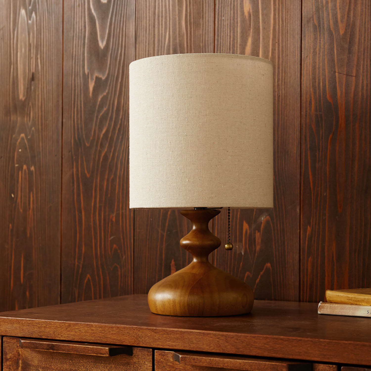 木製のベースデザインがなだらかなカーブを描き、レトロなたたずまいを感じさせるテーブルライトナチュラル感のあるファブリックセードから、やさしい光が灯りますコンパクトなサイズなので、ベッドサイドやシェルフの上など、さまざまな場所で使えます