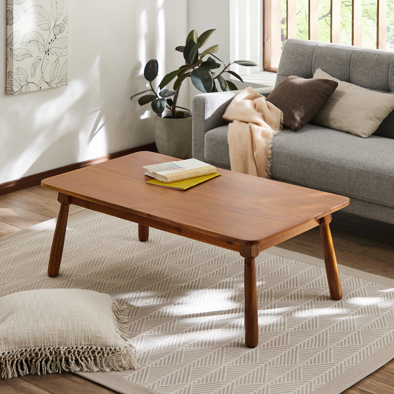 天然木の持つ木目を生かしたヴィンテージ風こたつバットを逆さにしたような脚部のデザインにこだわりました厚みのある天板のエッジには丸みを持たせ、やわらかい印象に仕上げていますこたつに見えないデザインで、オフシーズンもローテーブルとしておしゃれに活躍します