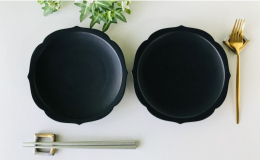■【ふるさと納税】有田焼 黒マット輪花桔梗渕6.5寸皿+角リング箸置き/各2個セット 深海三龍堂 スタイリッシュ シンプル デザイン モダン