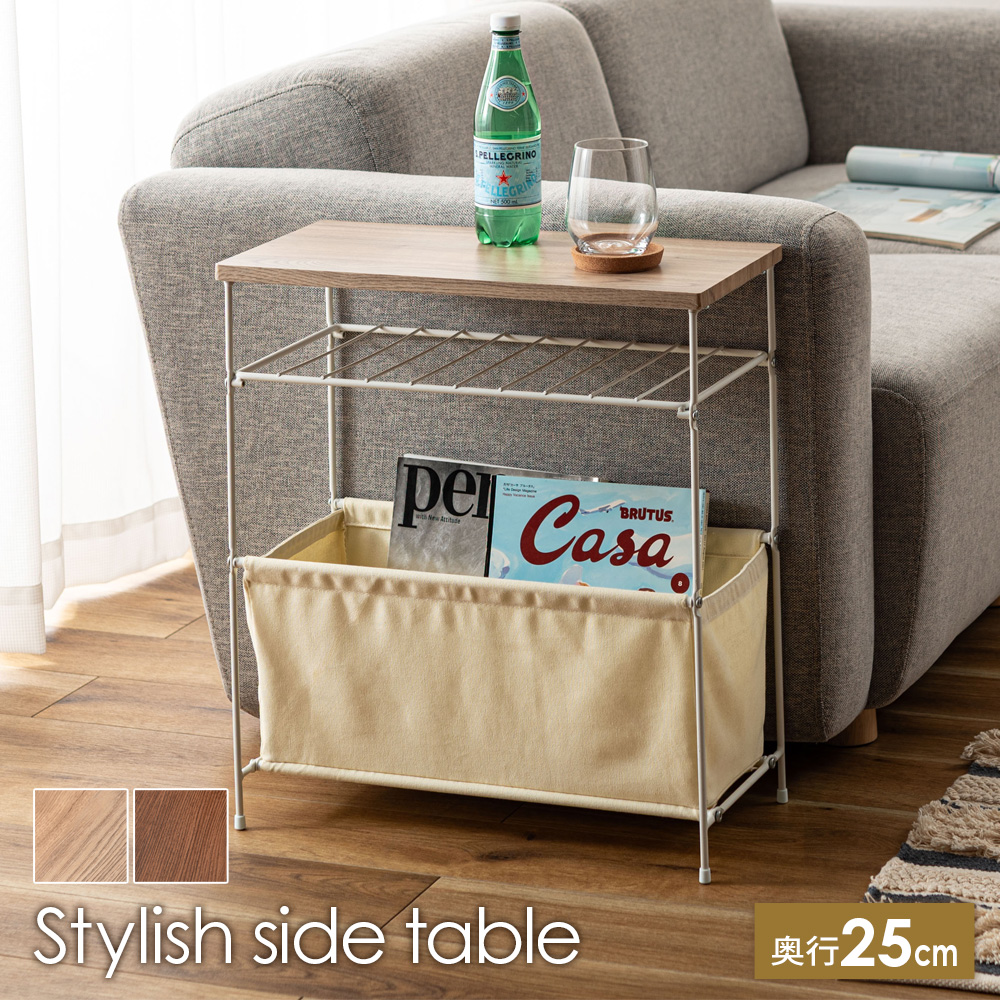 ■脇机 スタイリッシュ サイド テーブル 布製ボックスつき ホワイト /グレー | ナイトテーブル エンドテーブル スリム 天板 木目調 飾り棚