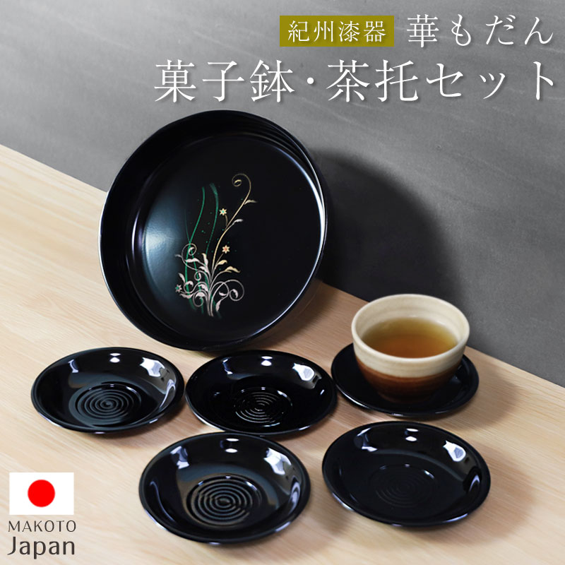 ■菓子盆 菓子鉢 茶托 コースター 6点 セット 紀州塗り 日本製 MAKOTO japan 華もだん 菓子鉢・茶托揃え おしゃれ かわいい 和風 仕様 お盆