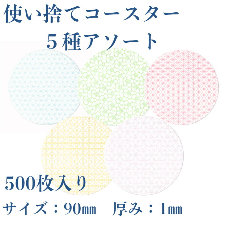 材質:クッション紙 サイズ;90×90mm(丸型) 厚み;1 入り数:500枚 製造:日本 吸水性のある紙製のコースターです。しっかりとした厚みがあります。紙素材なので燃えるゴミとして捨てられて片付けが楽! 大容量の500枚入り!飲食店様やホテル様におすすめ! 5種類のデザインが一緒になったアソートです。 爽やかな和柄をあしらったコースターです。同じ柄のマスクケース、箸袋、テーブルマットも販売中です。