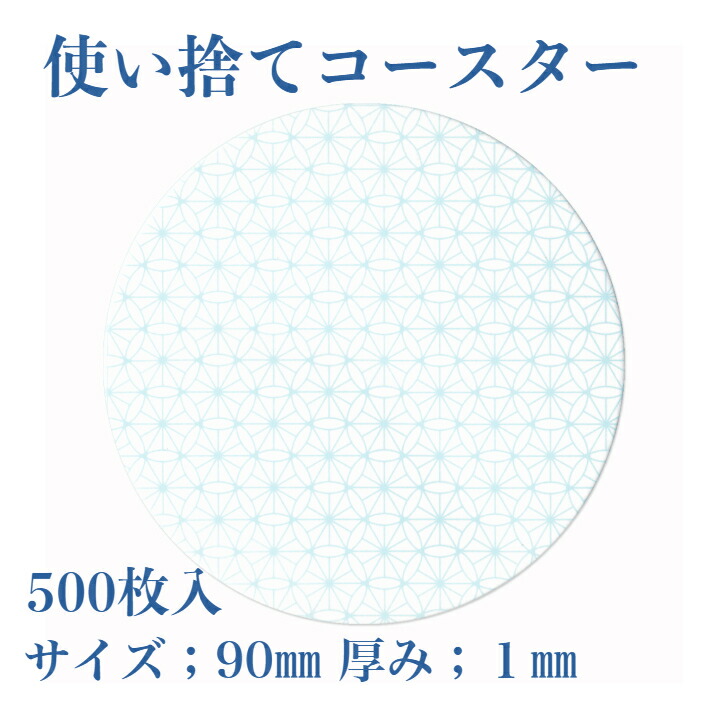 材質:クッション紙 サイズ;90×90mm(丸型) 厚み;1 入り数:500枚 製造:日本 吸水性のある紙製のコースターです。しっかりとした厚みがあります。紙素材なので燃えるゴミとして捨てられて片付けが楽! 大容量の500枚入り!飲食店様やホテル様におすすめ! 爽やかな和柄をあしらったコースターです。同じ柄のマスクケース、箸袋、テーブルマットも販売中です。