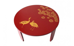 "松"と"鶴"の吉祥文様を現代風にアレンジした脚折式の「和風カフェテーブル」です。直径45cmのサイズは一人膳としてはもちろんのこと、和風のインテリアとしてお楽しみ頂けます。使わない時は脚が折れて高さ6.5cmとなりますのでとても収納便利です。塗装は島安オリジナルの乾漆塗装で、キズに強く大変丈夫です。"鶴"は長寿の意味と共に夫婦仲が大変良く一生を連れ添うことから「仲良きことの象徴」とされ、"松"は古くは神が依りつく樹として扱われ、常緑であることから長寿の意味と重ねられました。日本古来の吉祥文様のテーブルで、毎日を縁起良く過ごされてみてはいかがですか。