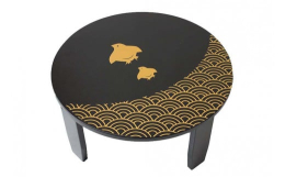 吉祥文様の"波千鳥"柄を現代風にアレンジした脚折式の「和風カフェテーブル」です。直径45cmのサイズは一人膳としてはもちろんのこと、和風のインテリアとしてお楽しみ頂けます。使わない時は脚が折れて高さ6.5cmとなりますのでとても収納便利です。塗装は島安オリジナルの乾漆塗装で、キズに強く大変丈夫です。"波千鳥"は、波を世間に例え、「大波小波も一緒に乗り越えていきます」という意味から夫婦円満、家内安全を表す縁起のよい文様とされています。また、"千鳥"="千取り"という語呂合わせから、勝運祈願・目標達成の意匠としても古くから使われています。日本古来の吉祥文様のテーブルで、毎日を縁起良く過ごされてみてはいかがですか。