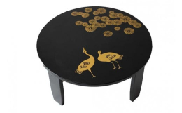 "松"と"鶴"の吉祥文様を現代風にアレンジした脚折式の「和風カフェテーブル」です。直径60cmのサイズは二人での食事にはちょうどいいサイズで、大きくもなく小さくもないとっても使い勝手の良いサイズとなっています。使わない時は脚が折れて高さ6.5cmとなりますのでとても収納便利です。塗装は島安オリジナルの乾漆塗装で、キズに強く大変丈夫です。"鶴"は長寿の意味と共に夫婦仲が大変良く一生を連れ添うことから「仲良きことの象徴」とされ、"松"は古くは神が依りつく樹として扱われ、常緑であることから長寿の意味と重ねられました。日本古来の吉祥文様のテーブルで、毎日を縁起良く過ごされてみてはいかがですか。