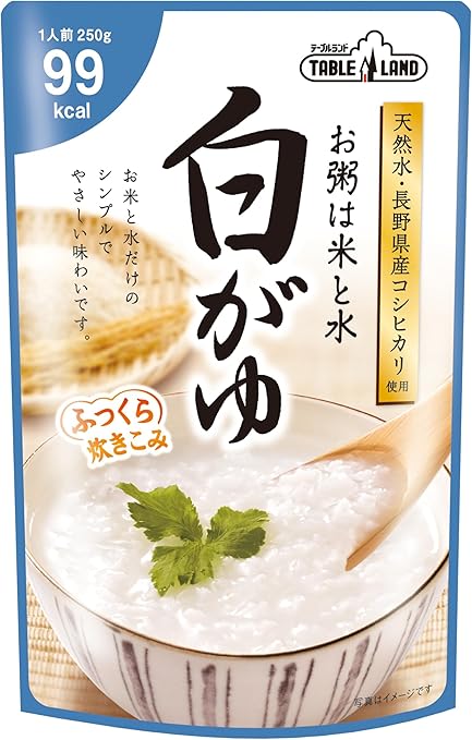 商品説明■商品特徴 ●厳選された国産コシヒカリを100%使用し、ていねいに炊き込みました。1食99kcal。 ●このお粥は五分がゆ仕立てです。●お米と水だけのシンプルな味わいのお粥です。お好みにより塩や醤油、ネギや胡麻のトッピングを加えても、美味しく召しあがれます。 ●温めずにそのままでもお召し上がりいただけます。 4902887035006 ■メーカー テーブルランド ■広告文責 ライフジェネレーション株式会社 TEL:06-6809-2484