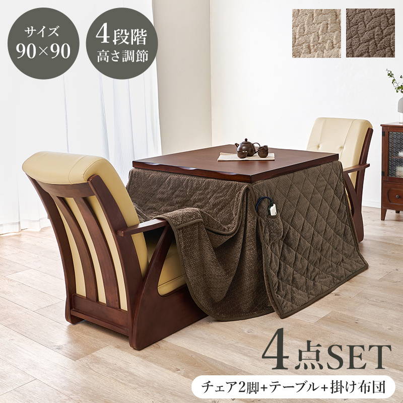 ■ダイニングこたつセット 2人用 4点セット 正方形 90x90cm 和風なぐり加工 キャスター付きチェア2脚 洗えるこたつ布団