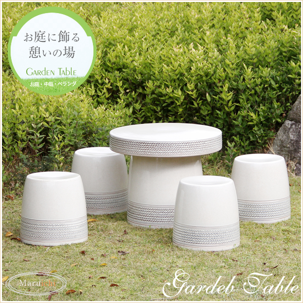 □□信楽焼ガーデンテーブル□□【品番】te-0020 【品名】信楽焼き20号白縄文テーブルセット 【セット内容】テーブル1点、イス4点【サイズ・重量】テーブル:直径60×高さ55cm 重さ:41キロ イス:直径35×高さ37cm 重さ:11キロ 【送料】この商品は、送料無料になります。ただし、北海道、沖縄、離島は800円掛かります。 陶器ですが耐久性に優れ雨風は勿論、少々の衝撃などでは、割れることはありません。 お庭、中庭、ベランダ、などをガーデンセットで憩いの場に演出してください。 イスの追加もできます。1点が25,100円になります。また、イスの数量を減らすこともできます。 イスのみの販売もさせて頂きます。 ご注文の際に備考欄にお書き下さい。
