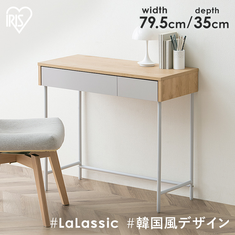 シンプルでお部屋に馴染むリビングデスクです。〜La Lassicシリーズ〜暮らしを豊かにする、真新しいデザイン家具。洗練された柔らかい雰囲気がお部屋のアクセントに。◆透明感のあるシンプルなデザイングレーの引き出しがお部屋のアクセントに。★お客様組立★※2人での組み立てをおすすめします。●商品サイズ(cm)製品外寸:幅約79.5×奥行約35.0×高さ約71.1引き出し内寸(大):幅約44.9×奥行約28.2×高さ約4.5引き出し内寸(小):幅約20.0×奥行約28.2×高さ約4.5●耐荷重(約cm)天板:20kg引き出し(大):2kg引き出し(小):2kg全体:24kg●主要材質木製部分:合成樹脂化粧パーティクルボード(メラミン樹脂)プリント紙化粧パーティクルボード、プリント紙化粧繊維板金属部分:金属(鋼)(エポキシ樹脂塗装)●必要工具+ドライバー(サイズ:2番)注意:電動ドライバーの使用可 ※インパクトドライバーは使用しないでください。※耐荷重は測定値であり、保証値ではありません。