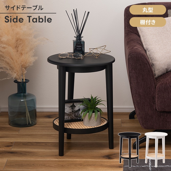 ■【値下げ】テーブル サイドテーブル 2段 幅36 ナイトテーブル 円形 丸型 ラタン調 収納棚付き 北欧風 おしゃれ シンプル ナチュラル