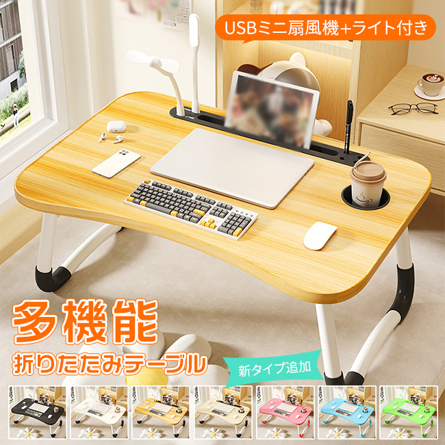 ■【新タイプ追加-USBミニ扇風機とライト付き】テーブル 折りたたみ 多機能 折りたたみテーブル 座卓 軽い パソコンデスク ベッドテーブル