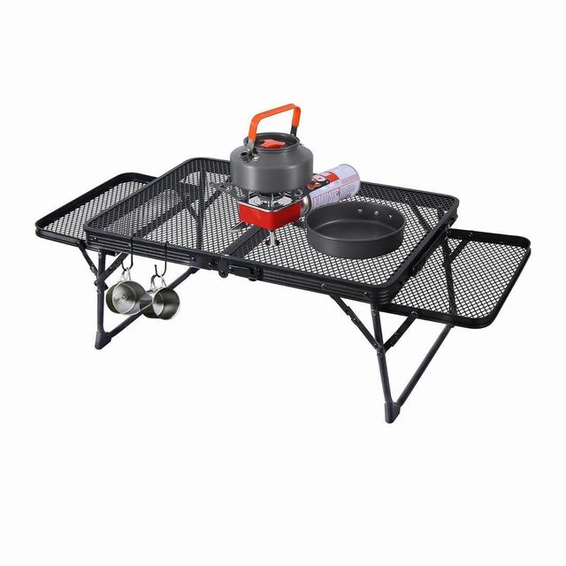 ローテーブル・ブラック ・商品仕様BBQテーブルの使用時サイズ:幅60cm×奥行40cm×高さ27/55cm. 付属の継脚パーツで高さを2段階ローテーブル・ハイテーブルに変えて使用が可能。収納サイズ: 40cm×30cm×6.5cm。耐荷重:25kg /耐熱温度:200度/重量:2200g商品内容テーブル、収納袋。 ・安定感抜群!筋交いプレート4本 キャンプは、砂の場所、芝生の場所、砂利の場所、土の場所など、いろんな場所で楽しむと思います。テーブルには調理器具、お酒などの飲み物、スマホやカメラなど、いろんな物を置きますので、より安定感が求められます。当商品は斜めに設置された4箇所の筋交いに加えて、より安定して使えるようにしました。 ・コンパクトな折り畳み式で持ちやすい設営・撤収は簡単で時間かかりません。収納バッグ付属し、収納サイズをコンパクトにし、持ち運びも楽で、キャンプではメインにもサブにもなるテーブルです。工具不要で、5秒ぐらい組み立てられます、説明書が無くても組み立てることが可能なシンプルな構造。 ・アウトドアテーブルだけでなく、室内の使用でも安