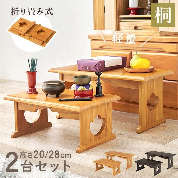 シンプルなデザインの折り畳み式供物台。幅45×高さ20cmの小サイズと幅60×高さ28cmの中サイズの2点セット。毎日使うお線香やロウソクなどのお参り道具を手前に出して使いやすくしたり、コンパクトで折りたたみが可能なので、お盆や法事、お正月など必要なときにだけ使ったりできます。頂き物のお供えや故人の写真・お菓子などを置くスペースにも。防腐性と防湿性に優れた桐材を使用しておりご年配の方や女性でも楽に持ち運ぶ事ができます。洋室にも馴染む明るい色味のナチュラルと、高級感のあるダークブラウンの2色からお選びください。【商品サイズ(約)】(小)幅45×奥行27×高さ20cm(中)幅60×奥行27×高さ28cm【梱包サイズ(約)】(小)49×32×10.5cm(1.7kg)(中)63.5×31.5×10.5cm(2kg)【材質】天然木桐材(ラッカー塗装)【生産国】中国【備考】完成品