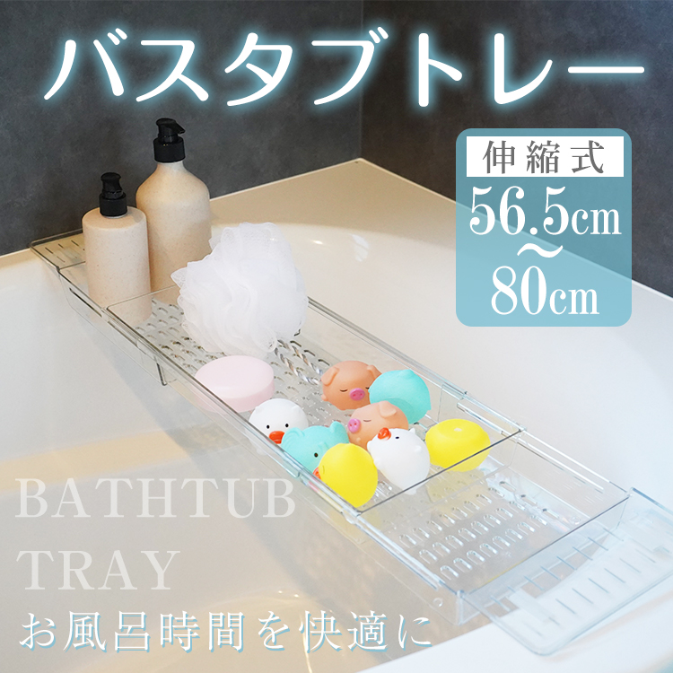 【商品内容】:バスタブトレー 【重量】:(約)643g 【耐荷重】:(約)10kg 【材質】:プラスチック 【幅調整】:(約)56.5〜80cm ■お風呂時間を快適に ■シンプルな構造で使いやすい ■浴槽の幅に合わせてトレーも伸縮! ■通気性のよいトレーで水切りでできる ■お子様のお風呂おもちゃの収納にも役立ちます