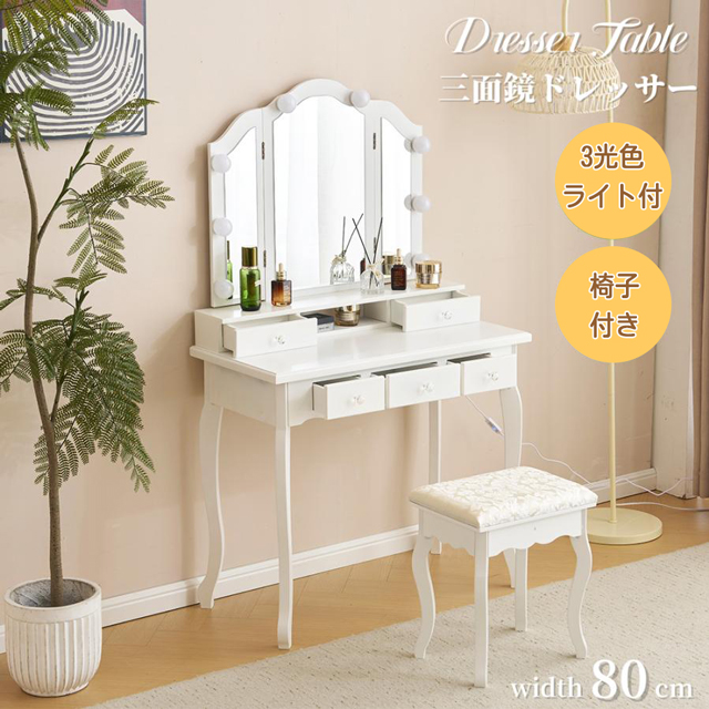 ■ドレッサー 化粧台 テーブル 鏡台 3色LED ライト付き 化粧台 女優ミラー 引き出し付き 収納 椅子セット サイド収納 メイク台 シンプル 大