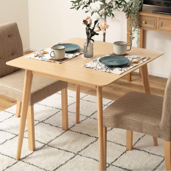 ●どんなインテリアにも合わせやすい、シンプルなスクエアテーブル。●省スペース向けのサイズながら、2人使いでもゆったりと食事ができる80角サイズ。●北欧風テイストの脚がハの字に広がるスッキリとしてデザインなので、どんな種類のチェアとも組み合わせやすいテーブル。●天板下の幕板は天板の反り止めや脚のグラつきを最大限抑え、テーブル全体に安定感を持たせてくれます。●ホワイト・ナチュラルどちらも、天板の表面は凹凸のない木目調仕上げ。●小口部分はデザイン性の高い船底形状。シャープですっきりとした印象なので、木製チェアからスチール素材を使ったチェアまで幅広く合わせられます。●脚裏にはフェルトが付いているので、床への傷防止にもなり安心です。商品サイズ:幅80×奥行80×高さ72cm材質:合成樹脂化粧繊維板/天然木(パイン)/ラッカー塗装生産国:中国備考:組立必要