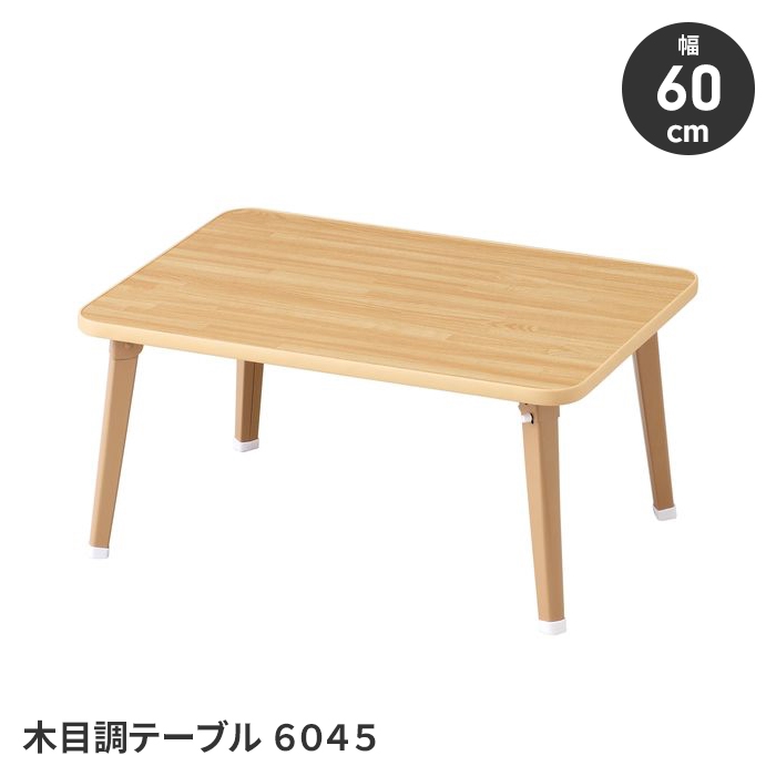 どんな場所でも使いやすい、木目調タイプのテーブルです。使用しない時は、脚を畳んで収納できます。天板は傷・汚れに強いメラミン加工。脚にはロック機能が付いているので、テーブルが倒れてしまう心配もありません。