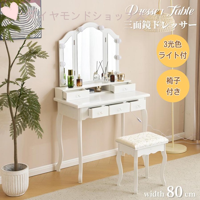 ■ドレッサー 化粧台 テーブル 鏡台 3色LED ライト付き 化粧台 女優ミラー 引き出し付き 収納 椅子セット サイド収納 メイク台 シンプル