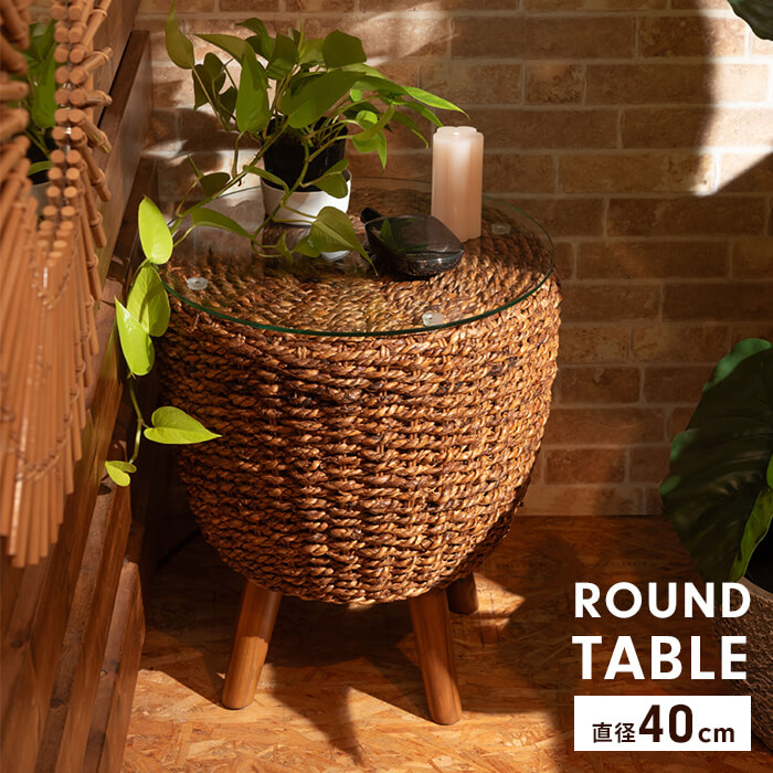 ■サイドテーブル 丸テーブル 直径40cm 高さ45cm ガラステーブル ナイトテーブル ラウンド 丸 円形 ミニテーブル ガラス天板 アジアン アバ