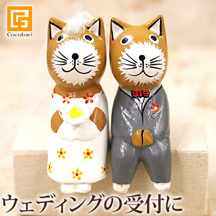 ■商品説明バリに行くと、精巧な木彫り作品をあちこちで見かけますが、かわいい動物の作品も多く作られています。ちょっと気の抜けたデザインや表情が、なんともかわいくて癒されます。木彫りの工房がたくさんある中で、上手な工房に作っていただきました。模様やカラーを微調整して、表情もかわいらしくしてもらいました。ウェディングドレスとタキシード姿のカップルの猫です。新婦はベールを付け、手にプルメリアのお花を持っています♪見ていると幸せな気分になりますね。手のひらサイズで、ちょっとしたスペースにも飾れます。結婚式で受付やテーブルなどの飾りとしてもおすすめ。また、プチギフトとしても喜ばれそうですね。さらにお部屋では、結婚式の思い出コーナーを作って写真と一緒に飾ってもいいですね♪■サイズ高さ:約8cm(サイズイメージを参照してください)■素材天然木■生産地バリ島■関連情報ウェルカムボード ウェディング雑貨 バリ猫 バリ 雑貨 アジアン 雑貨 小物 リゾート 木製 置物 木彫り グッズ カップル バリ雑貨、バリ島、アジアン雑貨