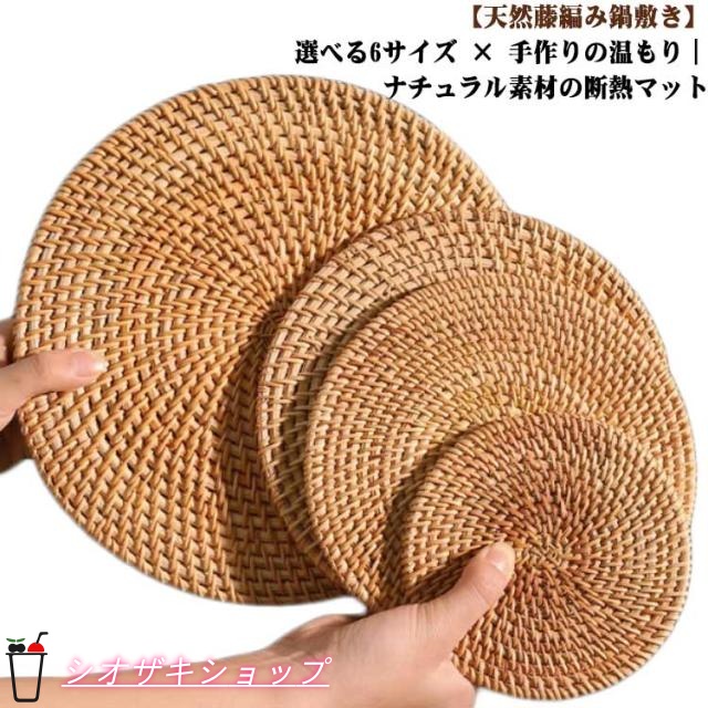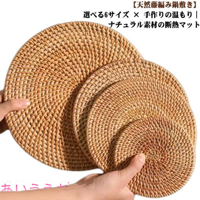 【6サイズ展開】コースター 鍋敷き 丸形 円形 ラウンド 藤編み ポップ テーブルウエア キッチン小物 耐熱 耐冷 手作り 天然素材 ナチュラル 洗える アジアン雑貨 インテリア 引っ越し祝い プレゼント