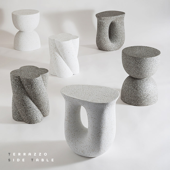 ざらりとした質感とテラゾー柄がおしゃれな、オブジェのようなサイドテーブル。 ざらりとした石のような質感とトレンドのテラゾー柄がおしゃれなサイドテーブルです。 テラゾーとは砕いた自然石をセメントや樹脂で混ぜ合わせた人造大理石のことで、ランダムに散りばめられた石の柄が特徴です。 高級感のある柄と安定感のあるフォルムで、インテリアを格上げします。 高さは約40〜46cmで、観葉植物を置いたり、ソファサイドやベッドサイドでコーヒーテーブルやサイドテーブルとして使うのにぴったり。 耐荷重は約15kgで、ディスプレイ台として、花台、小物置きなど様々な用途で活躍します。 カラーはそれぞれホワイトとグレーの2種類をご用意。 フォルムは、ツイスト、ハーフボール、リングがございます。 お好みに合わせた6種類の中からお選びください。 韓国風インテリアや海外風インテリア、モノトーンや無機質なテイストなど、高級感のあるモダンな雰囲気はもちろん、ビビットカラーの小物などとの組み合わせでポップなイメージにも変化します。