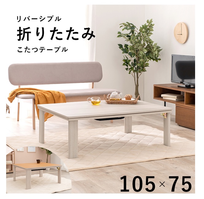 ・・ …--………--★★●商品詳細情報・サイズ 幅105×奥行75×高さ37cm・素 材 天板:MDF 塗装:パーチカルボード 塗装:PVCシート張り ヒーター:MS-303HS 石英管ヒーター(中間スイッチ)■仕 様・天板固定滑り止め付・脚折りたたみ式■メーカー直送☆★☆★カジュアルなデザイン★天板リバーシブル家具調こたつ☆★☆★ホワイトとナチュラルカラーのリバーシブル天板でお部屋の雰囲気に合わせて手軽に模様替え!脚を折りたためば女性でも簡単に持ち運びができ、使わない時は隙間にコンパクト収納できますよ。表面は質感のある木目調PVCシート!水分もはじくのでお手入れも簡単です。冬はこたつとして、春夏秋のオフシーズンはテーブルとして季節を問わず1年中お使いいただけるのも嬉しい利点。天板ズレ防止の滑り止め付きなので、こたつ布団を使わない時は天板を安定させることができます。