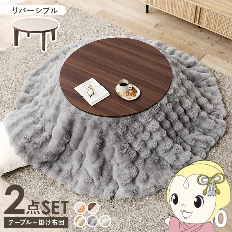 天板がリバーシブルでオールシーズン活躍するカジュアルコタツ。ラビットファーのような、ふわもこの掛け布団セット ■カラー:ブラウン/グレー ■サイズ:こたつ:(約)幅80×奥行80×高さ35.5cm、掛ふとん:(約)φ190cm ■素材:こたつ:<天板>パーチカルボード PVCシート張り <ヒーター>MS-303H 石英管ヒーター(中間スイッチ)、ふとん:<側地><中材>ポリエステル100% ■天板リバーシブル仕様 ■お客様組立品 ■生産地:こたつ:インドネシア製、ヒーター:マレーシア製、布団:中国製 ■こたつ掛け布団お手入れについて ・洗濯ネットをご使用ください。 ・家庭用ドラム式洗濯機の場合、故障の恐れがございます。縦型洗濯機か、コインランドリーをご利用ください。 ※お客様組立て品につきましては、組み立て後に不良の連絡をされても対応ができません。組み立て前にパーツに不良・傷等がないか、必ずご確認下さいますようよろしくお願い申し上げます。 ※記載は商品仕様の一部です。仕様説明不足等の理由での返品はできません。特に適合等は必ずご確認ください。