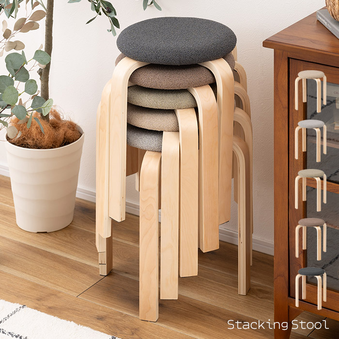 天然木とニュアンスカラー、丸みを帯びたデザインが優しい印象の北欧風スタッキングスツール。 北欧のデザイナーズチェアに用いられるような明るい木目の天然木バーチ材の合板を曲げ木加工した、ニュアンスカラーの丸型スツールです。 さらさらとしたファブリックのクッション性のある座面と、滑らかな天然木で優しい使い心地です。 重ねられるスタッキング仕様で、使わない時は省スペースで収納できます。 1脚約1.6kgと軽量ですので、重ねても軽々と持ち運びできます。 ソファのサイドテーブルや寝室のナイトテーブルとして、来客時のサブチェアや、玄関、洗面所でなど、様々なシーンで活躍します。 グレーベージュ、スモークグレー、オリーブ、モカブラウン、チャコールグレーのシンプルで落ち着いた5色をご用意しました。 どんなお部屋にもなじみ、上質な空間を演出します。
