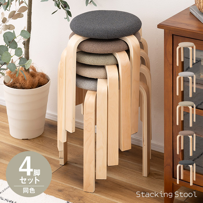 ■お得な4脚セット 木製 スツール スタッキングスツール 北欧風 丸 布張り 円 高さ45cm 曲木 座面クッション ファブリック 丸椅子 椅子 軽