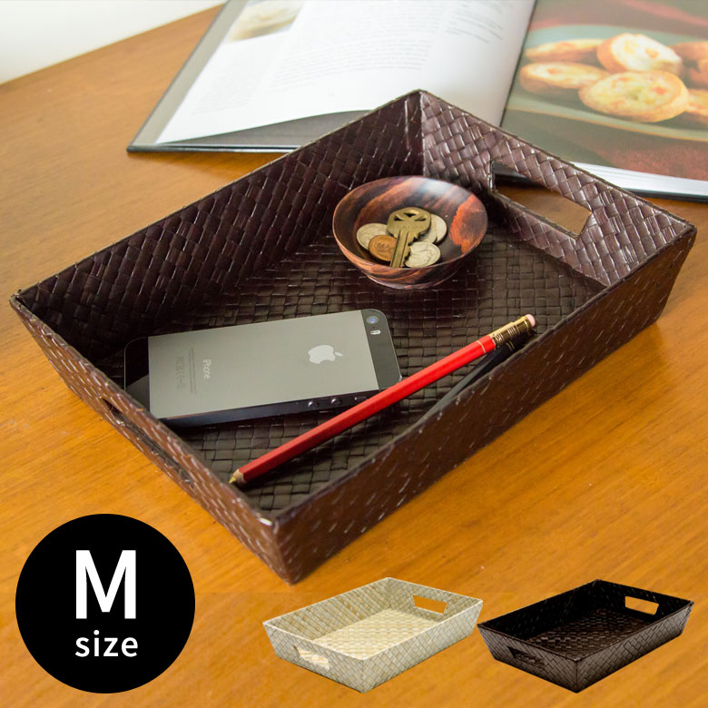 ■持ち手付き バスケット トレイ 小物入れ トレー デスク 机 整理 整頓 収納 小物トレイ アジアン バリ 雑貨 パンダン Mサイズ