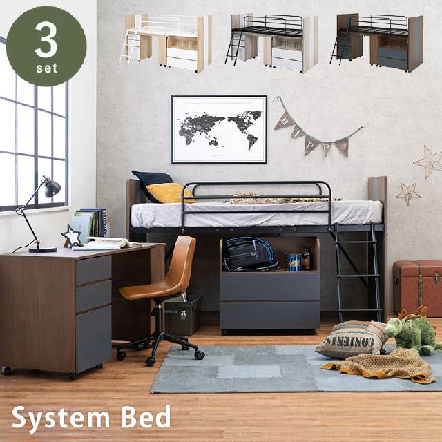 ■システムベッド3点セット ベッド シングルベッド デスク 平机 学習机 学童デスク デスク ワゴン キャビネット キャスター付き 組立品