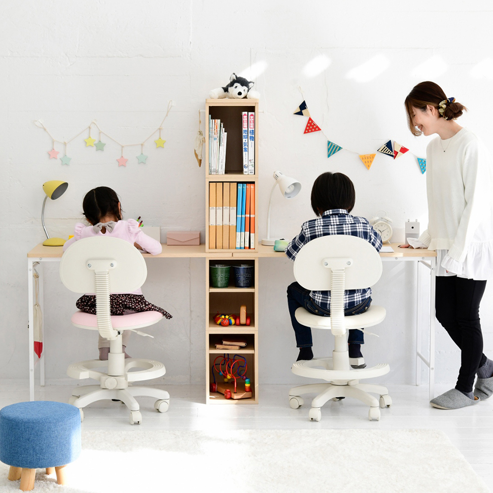 高さが座卓(ロースタイル)とデスク(ハイスタイル)の2段階に調節できるコンパクトデスク高さだけでなくラックの位置や天板サイズなど用途に合わせてマルチに組み替え可能リビングなどの限られたスペースにも設置しやすい省スペース設計背面もきれいな仕上げなので、置き場所を選びません手提げやランドセルがかけられる専用フックが付き天板にはコード落としがあるので、ライトやタブレットなどの配線もすっきり飽きのこない優しいトーンのナチュラルカラーで、お子さまが成長しても長く使えるシンプルデザイン横並びでもラックで仕切る事でしっかり自分のスペースを確保できます補助天板を2つのデスクの真ん中に設置することで幅215cmとわらにゆったりとした作業スペースにロースタイル、ハイスタイルの高さ違いで横連結することも可能お子さまが大きくなったら別々のお部屋で単独使いも◎[ロースタイル]チェアに座って集中しにくい小さなお子様にも最適ロースタイルで2台連結するとお部屋に圧迫感を与えず座学スペースがつくれます[ハイスタイル]勉強がしやすいベーシックスタイル可動棚付きのラックに教科書やファイルがスッキリ収納できます向かい合わせの設置すると天板が広く使えるのもうれしいポイント#勉強机 #子供机 #学習デスク #キッズデスク #子ども机 #PCデスク #ワークデスク #オフィスデスク
