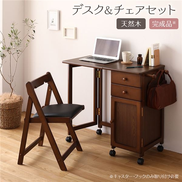 ■折りたたみ パソコンデスク/学習机 チェアセット〔ブラウン〕 幅88cm 木製 サイドチェスト付き キャスター 完成品 【北海道・沖縄・離島