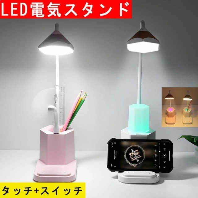 ■LEDデスクライト 卓上ライト 無段階調光 USBライト省エネ ペン立て スマホスタンド タッチセンサー 360°回転可能 USBポート付き 学習机