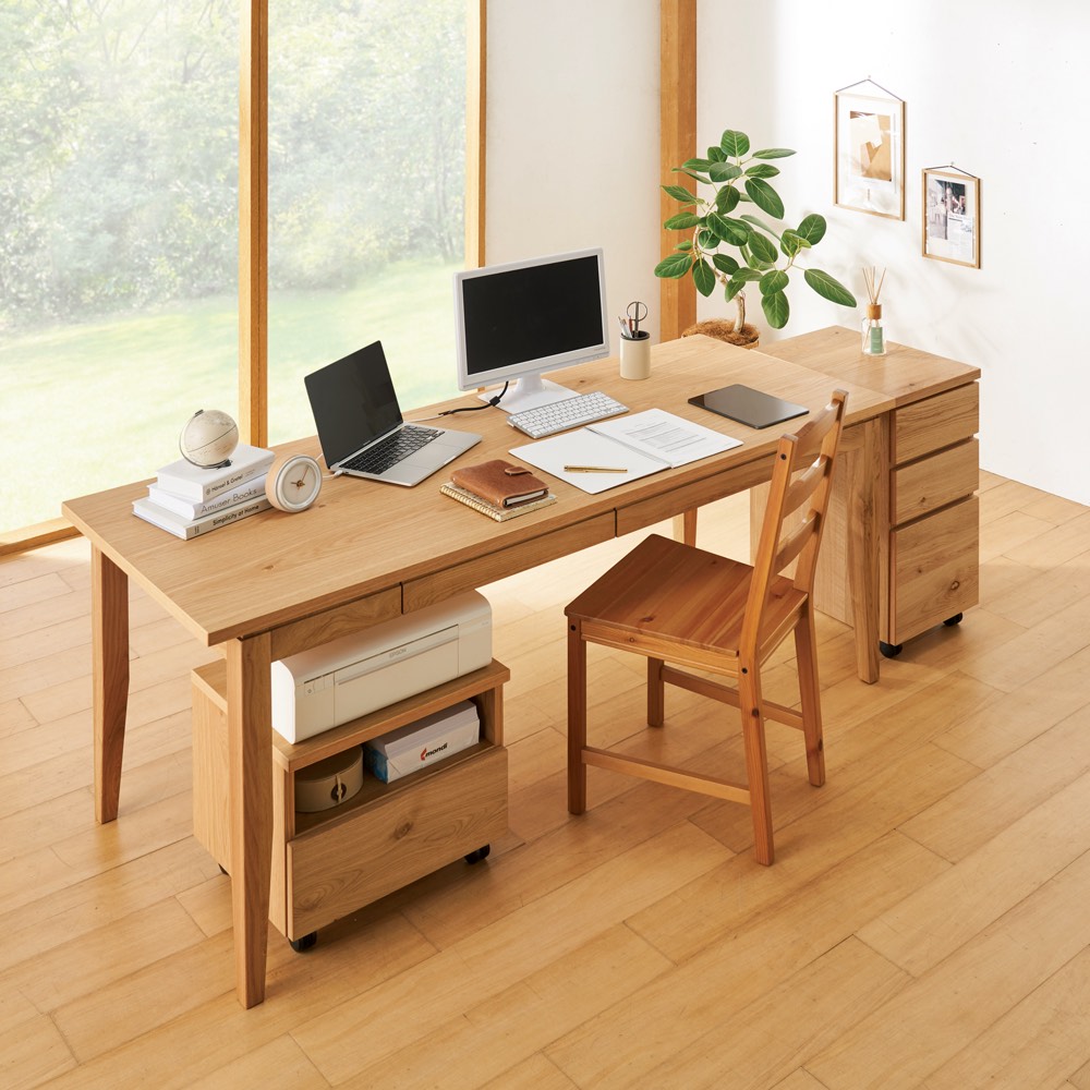 国産天然オークの豊かな風合いで温もりあるデスク空間に。北海道産のオークを使用した、味わい深いPCデスクシリーズ。オーク材特有の風合いが醸し出す自然の素材感。使い込むほどに味わいが増し、時と共に愛着も深まる独特の経年変化も魅力。テレワーク・リモートワークに、勉強机やダイニングテーブルとしてもおすすめです。奥行70cmの天板はPC+モニター、書類までゆったり広げられます。